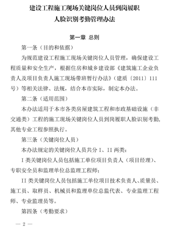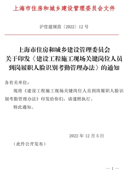 近日,上海市住建委印發(fā)《建設工程施工現(xiàn)場關鍵崗位人員到崗履職人臉識別考勤管理辦法》,自發(fā)布之日起施行。
