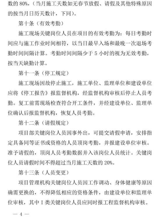 施工現(xiàn)場關鍵崗位人員考勤月到崗率不得低于當月施工天數(shù)的80%,(當月施工天數(shù)如無春節(jié)放假、請假及其他特殊原因的按當月日歷天數(shù)計,下同)。